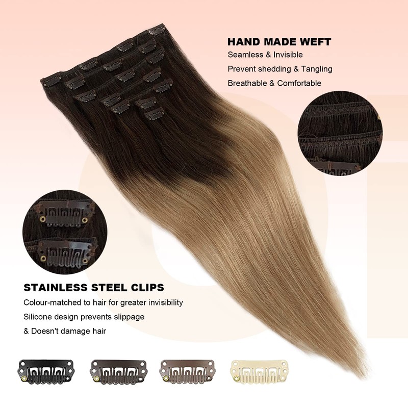 - [OMBRE COLOUR]: #4T27 is a ombre medium brown to caramel blonde hair extensions, with a variety of use scenarios for brides, women, girls and more. The same colour clips for a more invisible and natural look. Note: Light colours can be dyed dark, but dark colours cannot be dyed light.