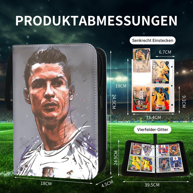 - Wide compatibility: this football card folder, which we have designed for football fans, is characterised by exquisite stitching and workmanship. It is not only compatible with football cards, but is also suitable for all kinds of sports cards, trading cards, playing cards, business cards, postcards, bank cards, stamps, cards of board games, photo cards, etc. in standard size more.