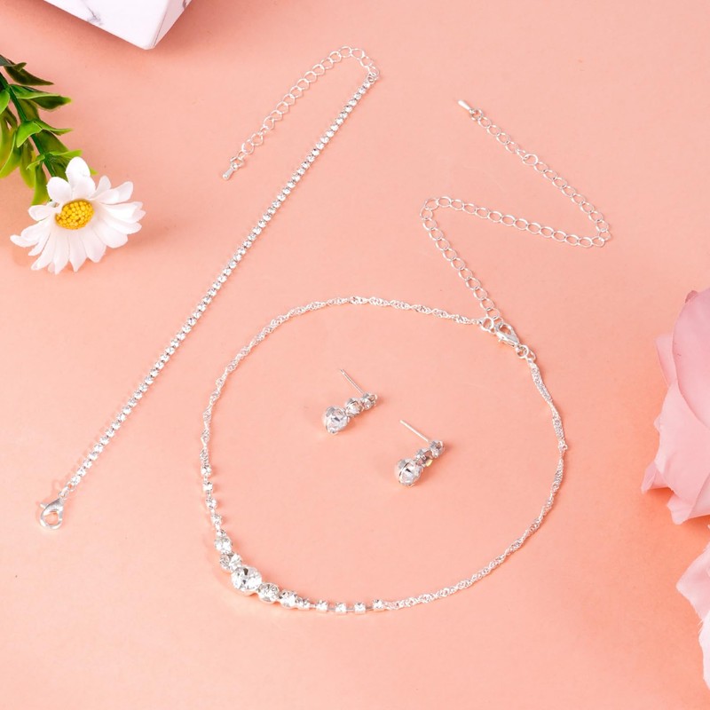- Silver Bridal Jewelry Set for Women: 1 dazzling rhinestone necklace for women, 1 adjustable sparkling bracelet, and 1 pair of teardrop rhinestone earrings. Great as wedding jewelry sets for brides or elegant bridesmaid jewelry set for bridal parties