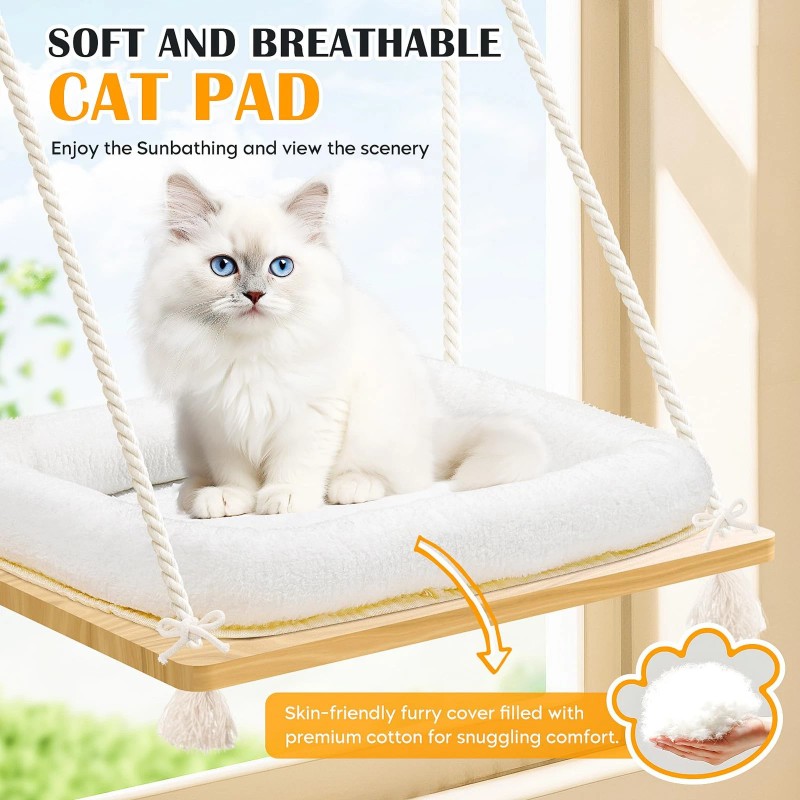 Strong and Sturdy Frame for Cat Bed: Our cat window hammock is built with a solid wood board and thick cotton ropes, with 4 strong suction cups capable of supporting up to 40 lbs, can withstand the jumping and activities of the cat, suitable for cats of all size