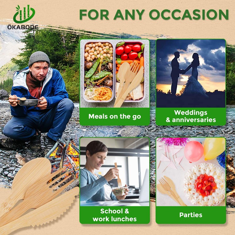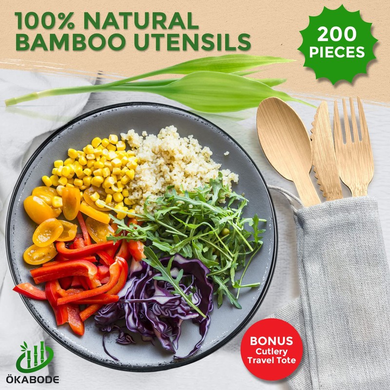 ÖKABODE - Utensilios de bambú desechables, 200 piezas por caja, cubiertos 100% de bambú, no cubiertos de madera, cubiertos respetuosos con el medio ambiente, utensilios biodegradables, 100 tenedores de bambú, 50 cuchillos, 50 cucharas