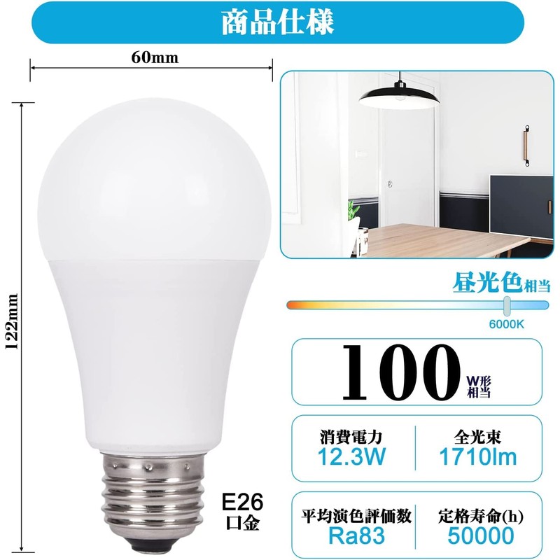 - Product Specifications: LED bulb is e26 base, 6,000K color temperature