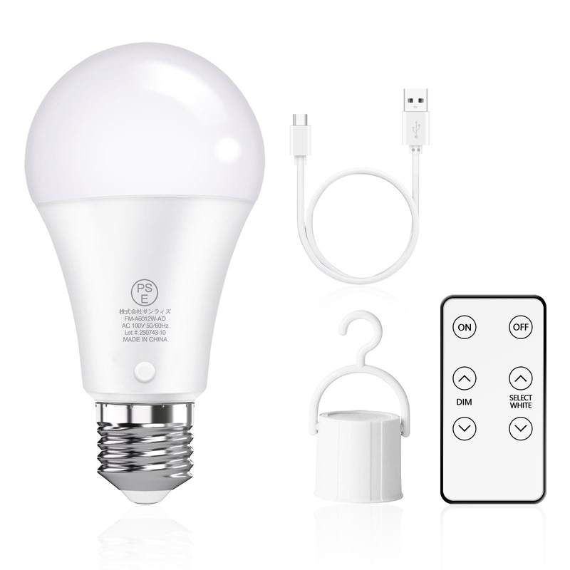 • 【リモコン操作で、調光や調色が可能】停電時や電球を取り外し後、付属赤外線リモコンで操作が可能。電球上のスイッチで、ON/OFF切り替え4段調光設定ができます。電球上のリモコンセンサーにリモコンを向ければON/OFF切り替え、リモコンで調光ができるだけでなく、5色調色【2700K-3000K-3500K-4000K-5000K】が可能です。※通電時でリモコン操作不可(安全規格のため)【高輝度60形相当LED電球】:LED電球は通常点灯状態(AC)時、約800ルーメン、白熱電球60形相当で、明るさ十分です。緊急状態(DC)時、約200ルーメン、節電のため、通常より少し暗くなりますが、明るさも十分です。