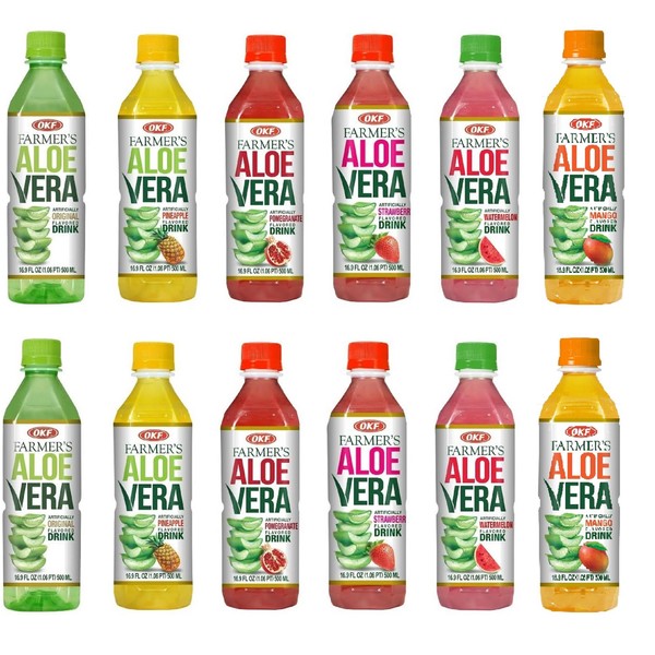 OKF Farmer's Aloe Vera Drink with Pulp Variety Pack includes Original, Pineapple, Mango, Watermelon, Pomegranate, and Strawberry.(6 Flavor Variety Pack, 12 Pack)