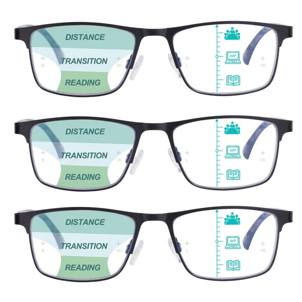 - 【Multifocus Progressive Reading Glasses】Progressive no-line bifocals have multiple magnification powers all in one lens. They allow you to see distance, intermediate, and near—or even more than one field at the same time—depending on where you point your eyes.
