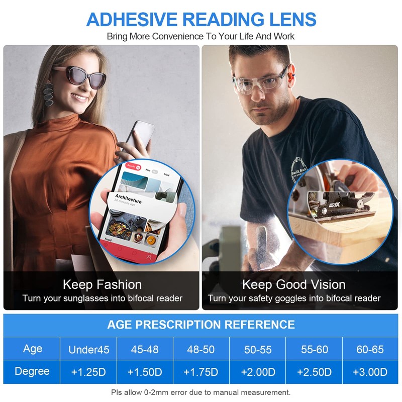 - 【 Convenient Adhesive Bifocal Lenses 】Easy carried for outdoor, no water needed, easy to install, stick the readers lens directly to the inside of your eyewear to get clear vision anywhere.