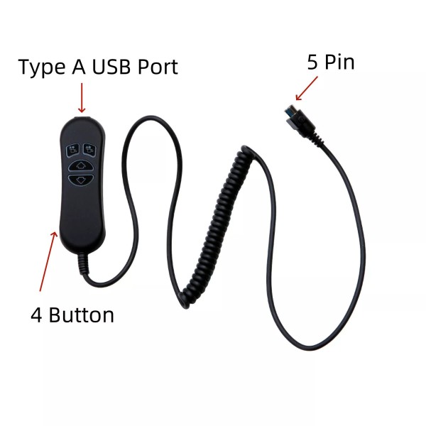- This remote has a long black housing with 4 large black buttons that have usb and backlight, you could charge your phone