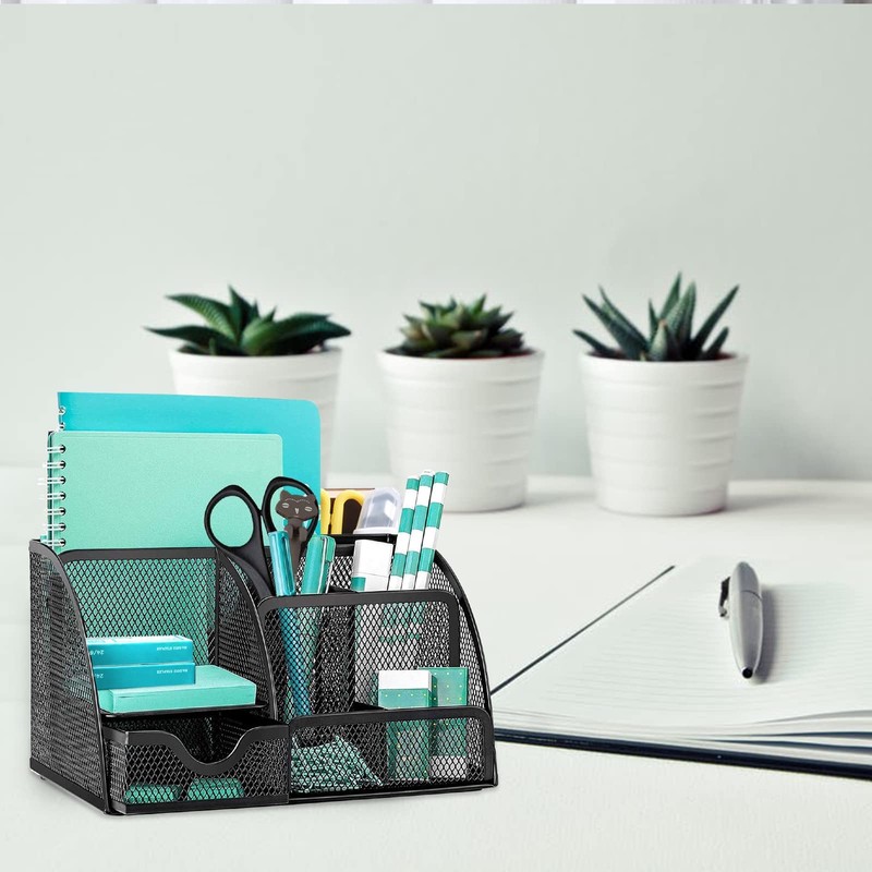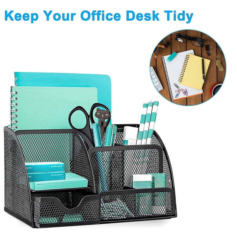 OKPOW Mesh Desk Organiser,Multi-Use Desk Tidy & Pen Holder with 6 storage and 1 Slide Drawer,Stationary Organiser for School,Home,Office desktop supplies (Black)