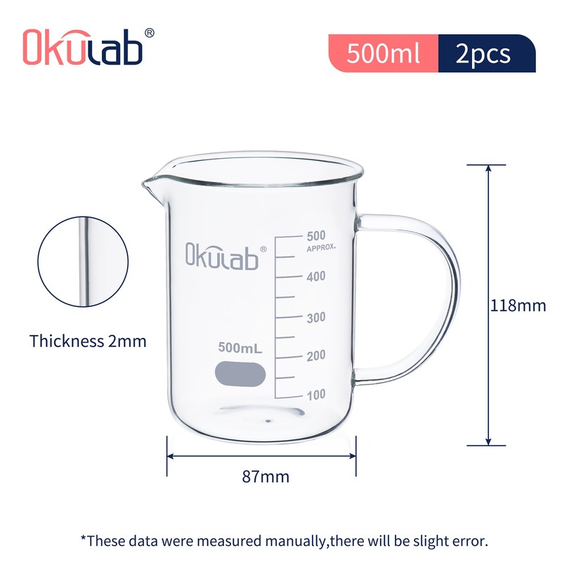 Okulab Glass Beakers with Handle, 2 Pcs 500ml 3.3 Borosilicate Glass Beaker Measuring Cups with Spout for Laboratories, Classrooms or Home, Lab Beakers, BKLGH500A2