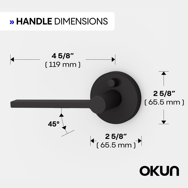 - DIMENSIONS: The matte black door handle measures 4 5/8" length, with a rosette diameter of 2 5/8" and a 45-degree angle lever projection.