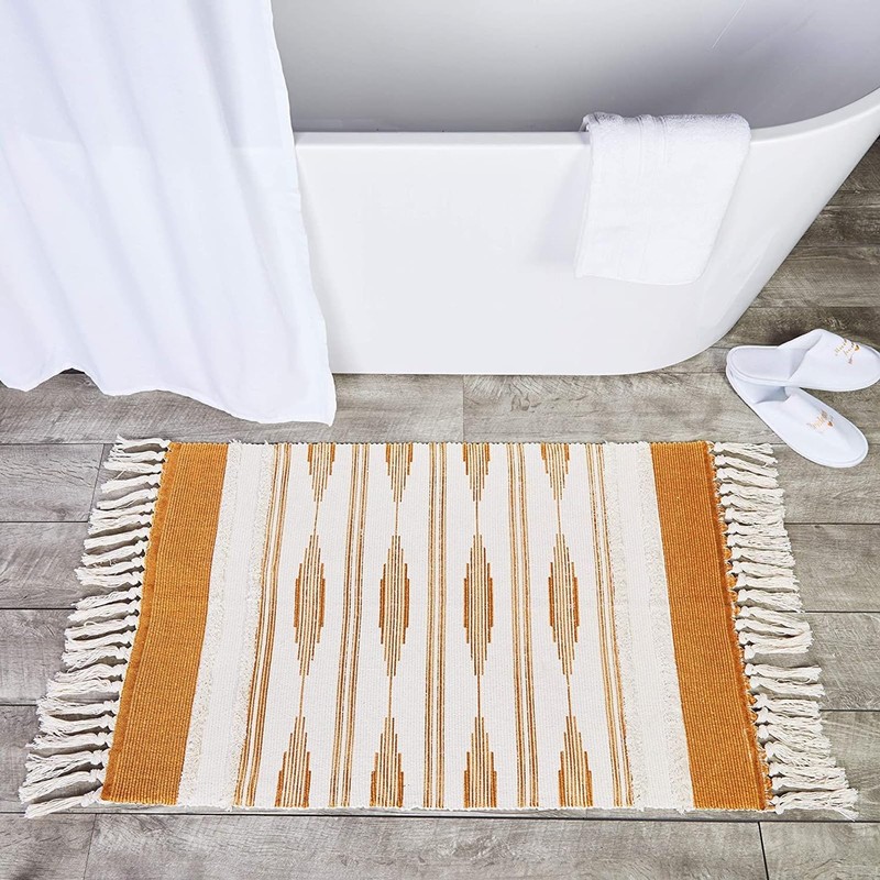 - Bohemian Style Bathroom Rug: Provide your feet and toes with warmth and comfort in a bathroom, hotel, sauna, shower, gym, bedroom, or living room with this yellow bohemian bathroom rug with tassels