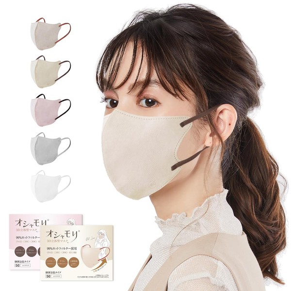 [OKUYOSHI] 3D立体マスク 56枚 息がしやすい メイクキープ 小顔マスク 三層構造 高機能マスク マスク 不織布 使い捨て おしゃれ 幅広耳ひも 耳が痛くならない バイカラー選択可能 56枚 グレージュ+紐ショコラ