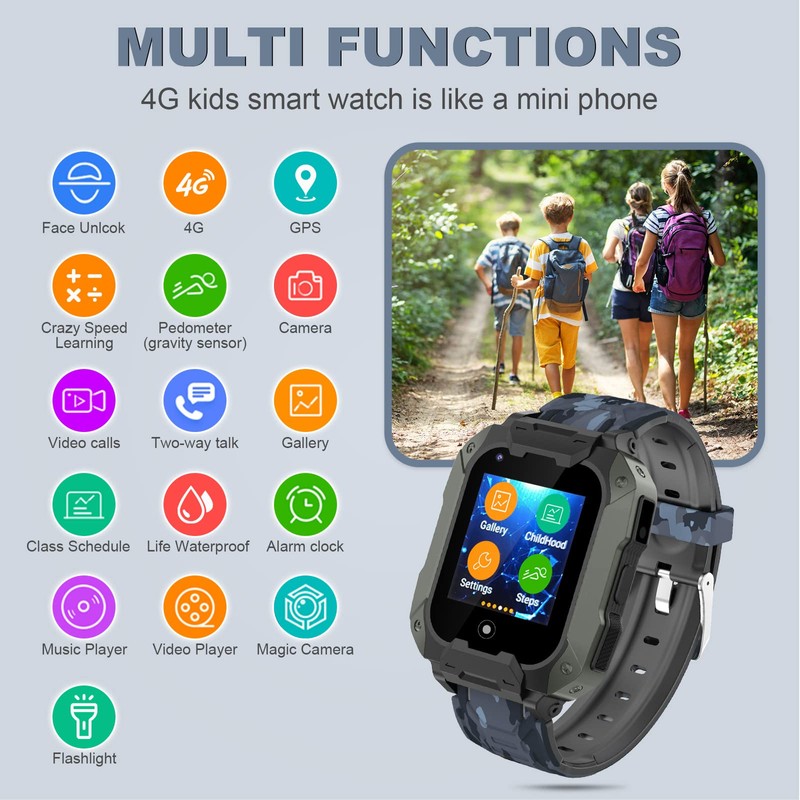 - Multifunctional 4G children's smartwatch: Our smartwatches for children have all the desired functions, such as torch, video playback, music playback, recording, maths games, school mode, multiple languages, HD touch screen and application store (large app available for download) etc. function.