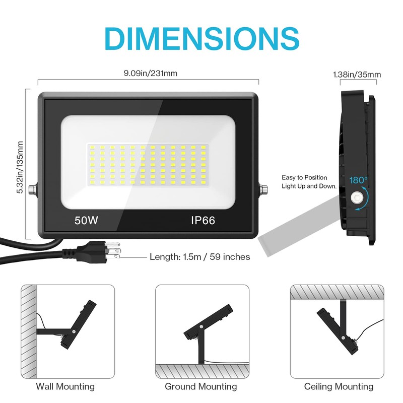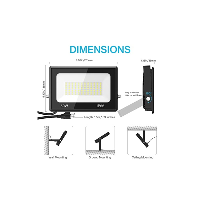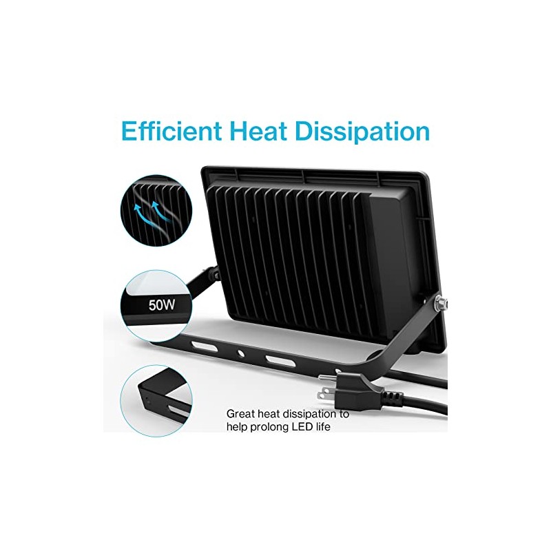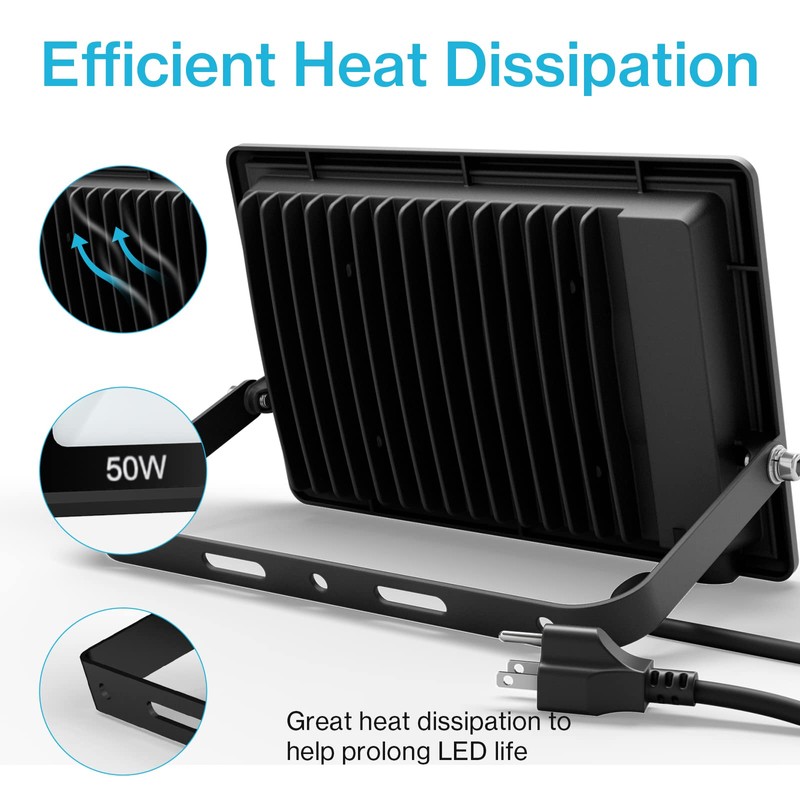 - DURABLE & LONG-LASTING: Our 50W flood lights are designed with efficient fin type heat sink design and aluminum material. The innovative heat dissipation can prolong LED lifespan to 30,000 hours.