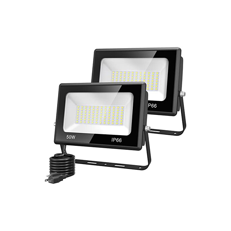 Olafus 2 Pack 50W LED Flood Light Outdoor, 5000LM Super Bright LED Work Lights Plug in, IP66 Waterproof Exterior Floodlight, 6500K Daylight White Security Light for Yard Lawn Garden