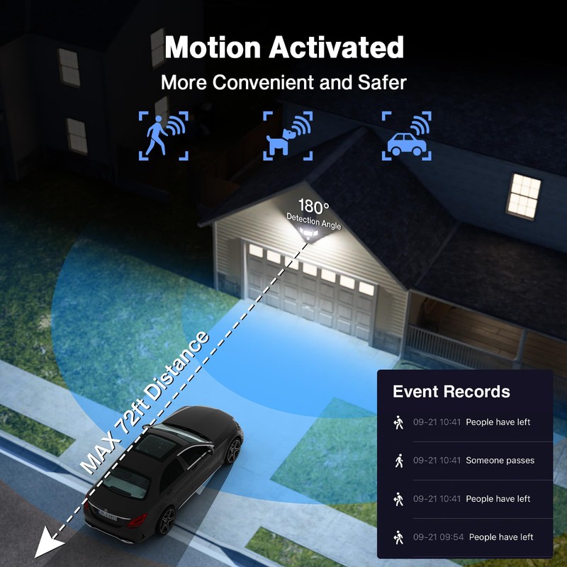 - Enhanced Motion Sensor: With a maximum 180° detection angle and a range of up to 72 feet, flood lights outdoor motion sensor offers three adjustable sensitivity levels for quick and sensitive motion detection. App support allows recording of each activation, setting a motion delay timer (6 seconds to 60 minutes), and group linking (multiple lights can be triggered and illuminated simultaneously)