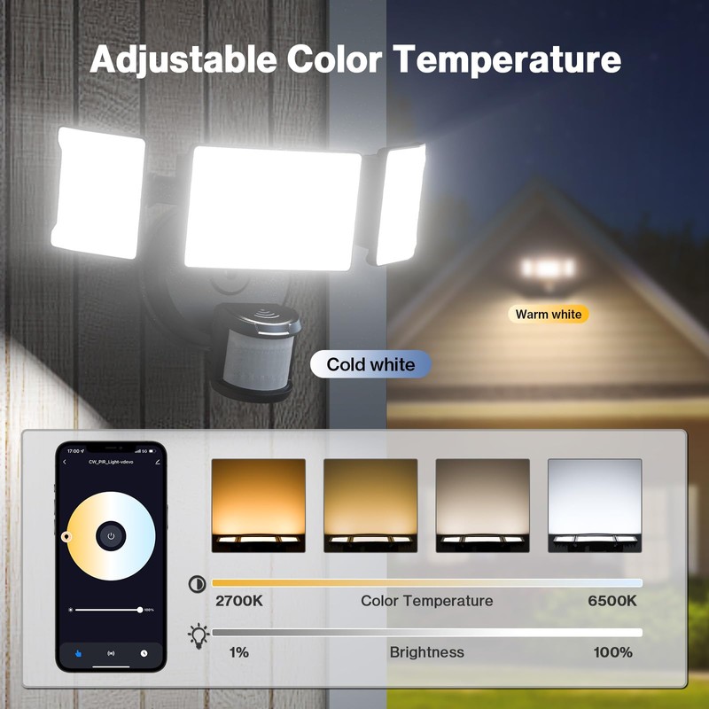- Adjustable Color Temperature & Brightness: Smart wifi flood lights offers stepless dimming, allowing you to smoothly transition the color temperature from warm white (2700K) to daylight to cool white (6500K). It also features a memory function, retaining your last setting upon power-on. A low-light mode provides minimal illumination when the sensor is inactive, saving energy