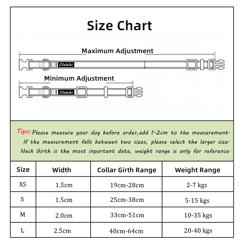 Please measure your dog’s neck circumference before ordering, and add 1-2CM to make sure your dog feel comfortable.