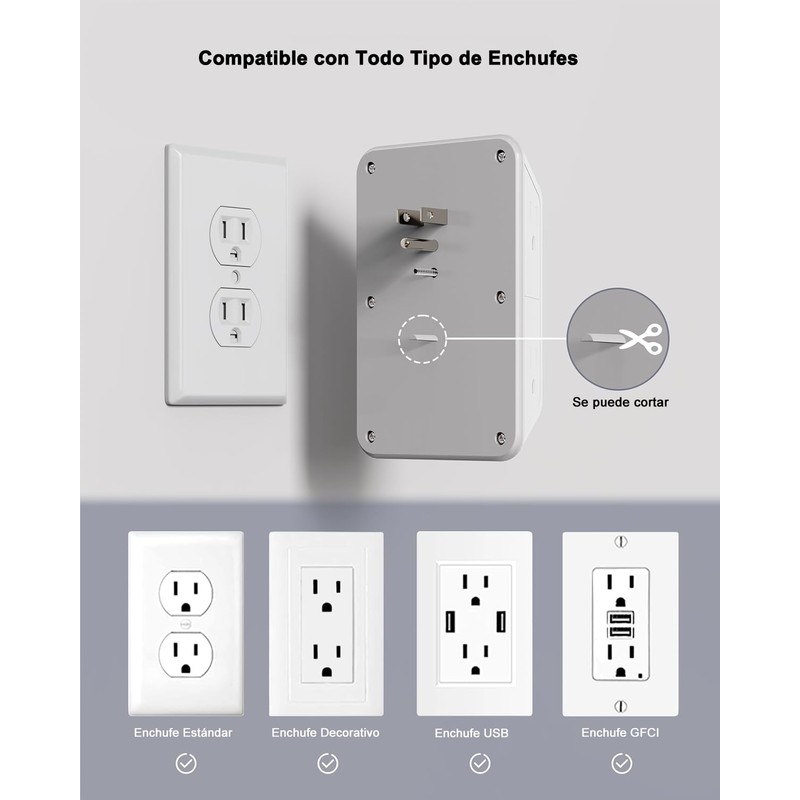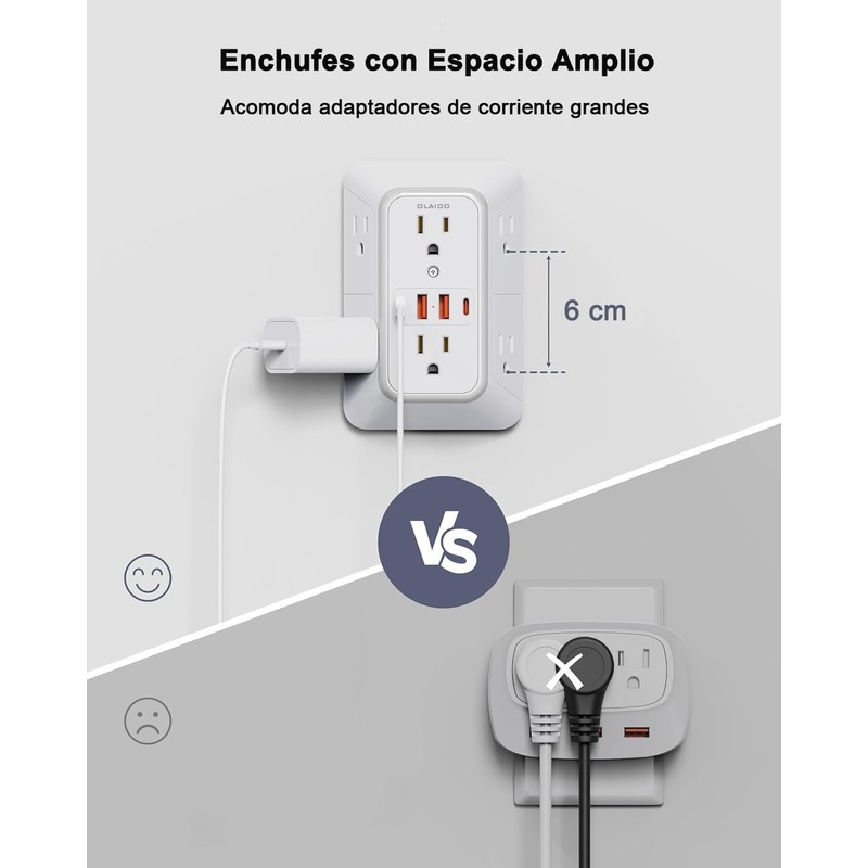- [Enchufe Múltiple con Espacio Amplio] Diseñado con un espacio amplio de 2.15 pulgadas entre enchufes, el protector de sobretensión de pared es ideal para todo tipo de enchufes sin bloquearse entre sí, especialmente para enchufes grandes. Su tamaño compacto ocupa menos espacio en tu escritorio o equipaje, siendo un accesorio imprescindible para viajes, oficina, dormitorio, cocina, etc.