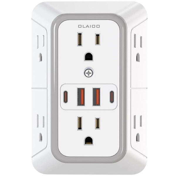 - [Función 10 en 1 USB en Enchufe de Pared] Este extensor de enchufe de pared incluye 6 enchufes de CA, 2 puertos USB-A y 2 puertos USB-C. Se adapta perfectamente a enchufes dobles, solo conecta y usa. El puerto de tornillo ayuda a mantener el protector de sobretensión bien sujeto al enchufe. Nota: Para algunos enchufes, se puede cortar la espiga de plástico blanca antes de usar.