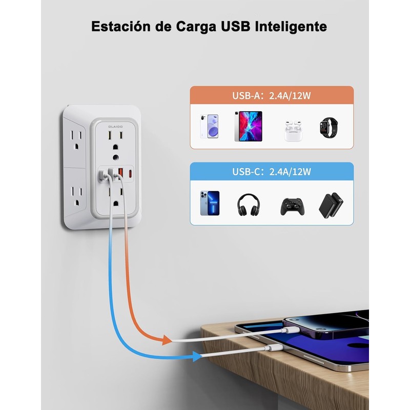 - [Enchufes de Pared con Puertos USB] El enchufe de pared extra cuenta con 2 puertos USB-A y 2 puertos USB-C. Cada puerto USB tiene una salida máxima de 5V/2.4A. Con tecnología inteligente incorporada, detecta los dispositivos de carga y proporciona automáticamente la velocidad de carga óptima, compatible con la mayoría de dispositivos USB. Nota: El puerto USB-C no es compatible con otros dispositivos que requieran un voltaje de carga de 14~22V.