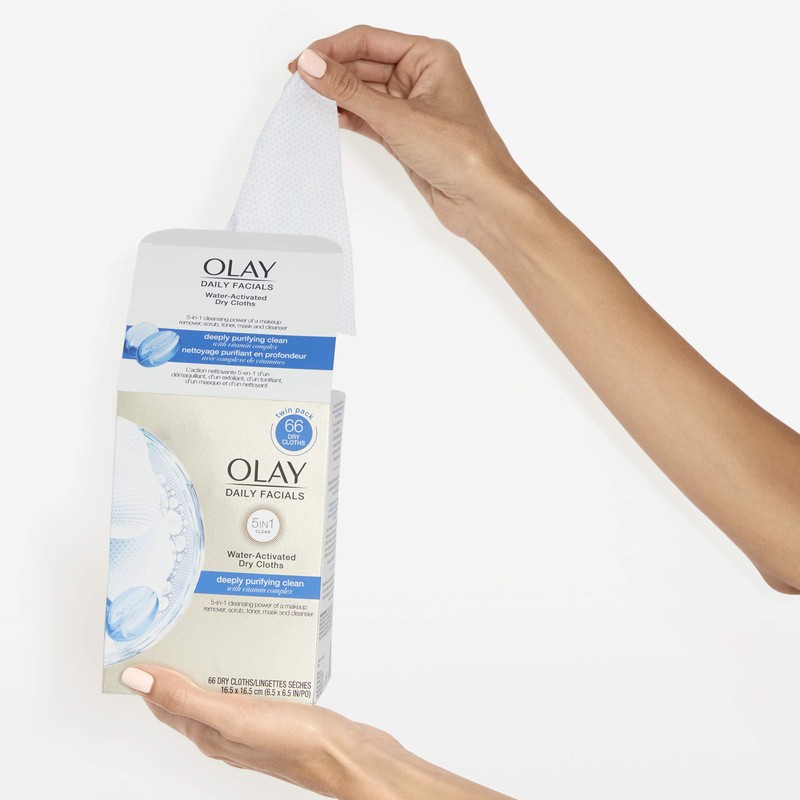 Refresh your skin with the power of Olay Deeply Clean 4-in-1 Water Activated Cloths. Formulated with vitamin B5, salicylic acid and witch hazel, each cloth features one smooth side and one exfoliating side with 3000 exfoliators. Perfect for combination/oily skin types, these specially textured cloths have the cleansing power of a scrub, toner, mask and cleanser to gently exfoliate skin. They clean deep down to the pores to remove dirt, oil and makeup—even mascara—2x better than basic cleansing. These convenient face wipes combine a soap-free lather and effective Olay conditioners to leave your skin clean, hydrated and smooth in less than one week. For on-the-go, travel or daily cleansing, pamper your skin with Olay Water Activated Cleansing Cloths.