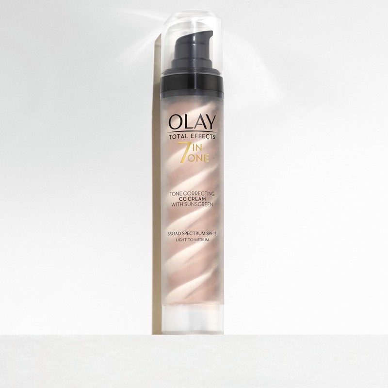 Product DescriptionOlay Total Effects Tone Correcting Moisturizer offers you an advanced CC Cream formulated to fight 7 signs of aging C like uneven tone, age spots and wrinkles C while providing instant coverage for flawlessly beautiful skin. CC for yourself. Just apply Total Effects Tone Correcting Moisturizer liberally and blend evenly with your fingertips for instant coverage that reduces the appearance of fine lines, wrinkles and discoloration. This hardworking CC Cream also provides nourishing moisturization and includes a broad-spectrum SPF 15 sunscreen to protect your skin from exposure to the sun's harmful rays. Use Olay CC Cream alone or layered under your favorite foundation for even better coverage.Brand StoryBy OlayFrom the ManufacturerOlay Total Effects Tone Correcting Moisturizer offers you an advanced CC Cream formulated to fight seven signs of aging C like uneven tone, age spots, and wrinkles C while providing instant coverage for flawlessly beautiful skin.CC for yourself. Just apply Total Effects Tone Correcting Moisturizer liberally and blend evenly with your fingertips for instant coverage that reduces the appearance of fine lines, wrinkles and discoloration. This hardworking CC Cream also provides nourishing moisturization and includes a broad-spectrum SPF 15 sunscreen to protect your skin from exposure to the sun's harmful rays.Use Olay CC Cream alone or layered under your favorite foundation for even better coverage. Key Features Instant skin-perfecting coverage and correction Broad Spectrum SPF 15 For Light to Medium skin tones Fights seven signs of aging, including uneven tone, age spots, and dull skin Find Your ShadeOlay CC Cream is available in three shades: Fair to Light: For skin with ivory or peach tones Light to Medium: For skin with light beige or sandy tones Medium to Deep: For skin with honey or caramel tonesEach shade of Olay CC Cream is designed to blend in with your natural skin tone. All you need is a pump or two for instant, flawless coverage that fights seven signs of aging. Results: Complete CoverageOlay CC Cream combines anti-aging and beauty balm to color and correct in one simple step. CC The Difference Reduces appearance of fine lines and wrinkles Balances and helps even out skin tone Reduces appearance of age spots Improves surface cell turnover with gentle exfoliation Provides nourishing moisturization to prevent dryness Strengthens skin's natural defense against moisture loss Recaptures youthful luminosity Get The Total EffectReveal your most beautiful skin in just three steps. Combine Total Effects cleansers, moisturizers, and treatments to more effectively fight seven signs of aging.Step 1: CleanserGently cleanse away impuritiesStep 2: MoisturizerFirm and hydrate skin with seven anti-aging benefits in every moisturizerStep 3: TreatmentAdd a boost to your routine by targeting specific skincare concerns Frequently Asked QuestionsIs Olay Total Effects CC Cream superior to BB Creams?Olay CC Creams work harder than BB Creams because they do more than just provide instant coverage and SPF protection. Olay CC Creams also offer longer-term correction benefits, helping to fight the seven signs of aging over time.What level of coverage does Total Effects CC Cream deliver?Total Effects CC Cream is in between a tinted moisturizer and foundation. It provides more sheer coverage than foundation, so it can be used to replace or in addition to foundation.