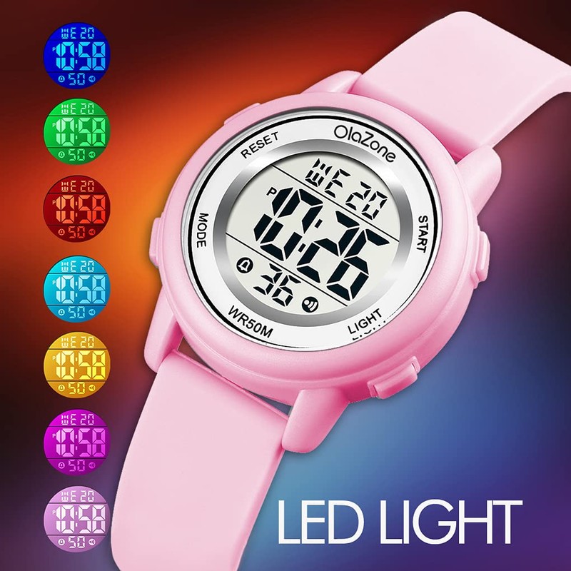 OLAZONE Kids Watch Girls Digital 7-Color Flashing Light Water Resistant 164FT Alarm for Age 7-12 (pink1)