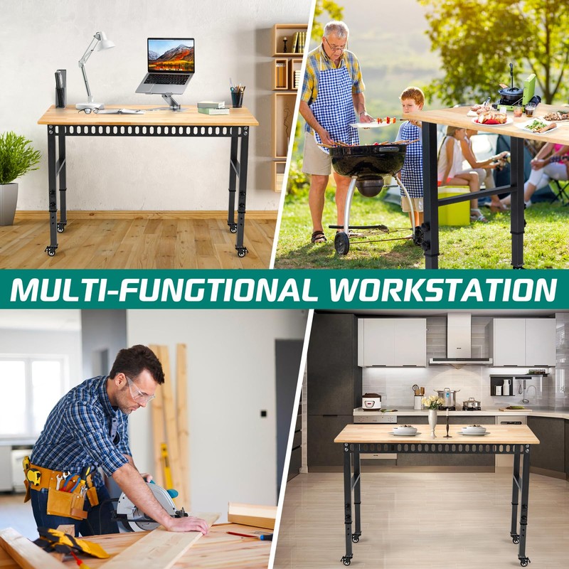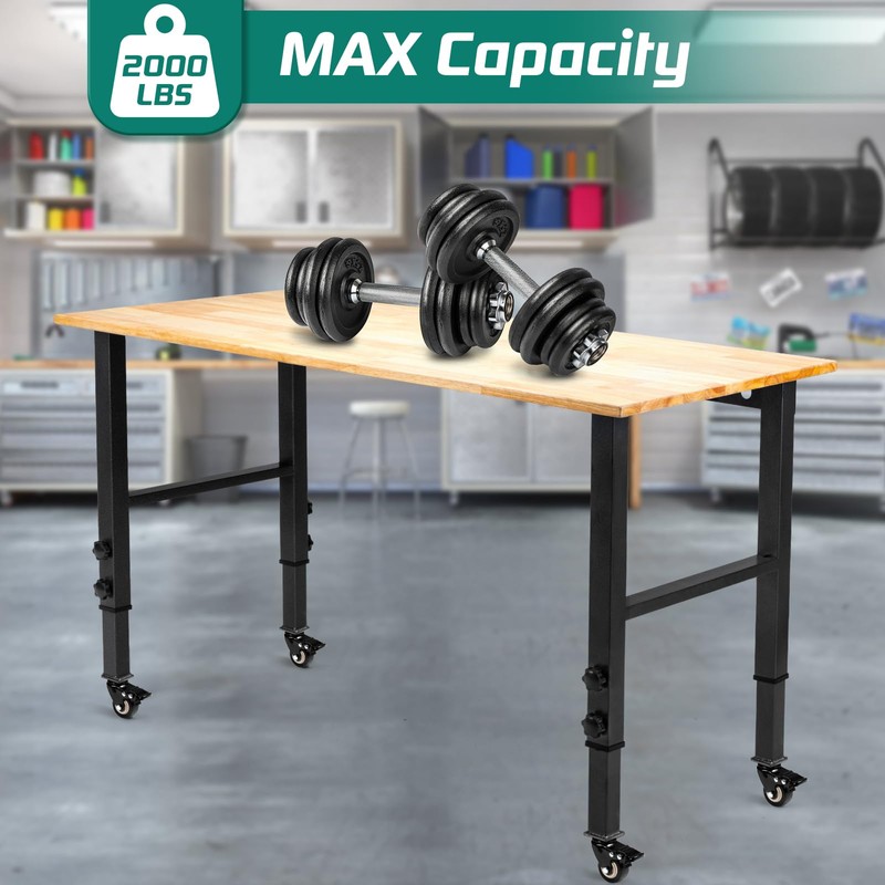 OLBRUS 48 "Adjustable Wheels Workbench, Heavy Duty 2000 LBS Load Capacity Hardwood Workbench Suitable for Workshop, Office, Garage, Home (Metal Wheels丨No Power Outlets 48"x24")