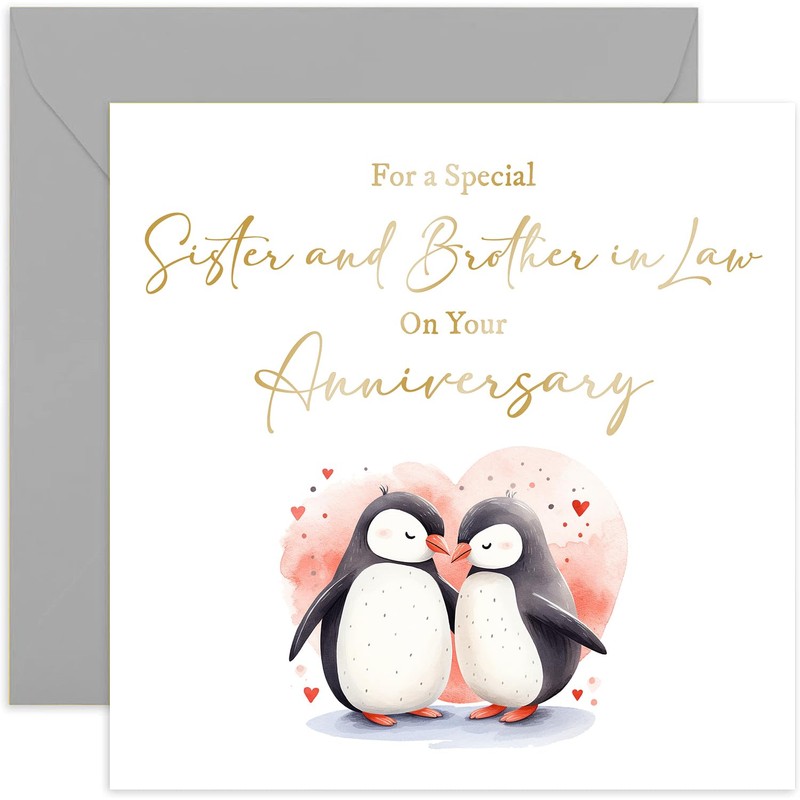 Old English Co. Wedding Anniversary Card for Sister and Brother in Law - Love Penguins Design - Special Gold Foil Wedding Anniversary Card for Them | Blank Inside