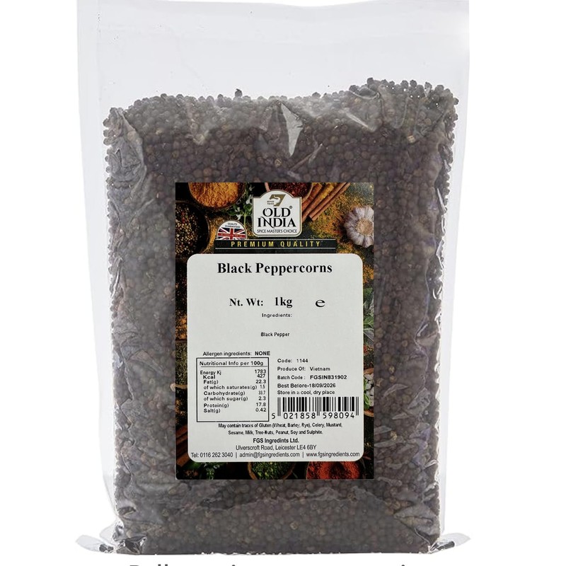 Product DescriptionOld India now has over seven hundred top quality herbs, spices and seasonings available on Amazon.co.uk.IngredientsBlack PepperDirectionsStore in a cool dry place away from direct sunlight.Manufacturer Contact InformationUlverscroft Road, Leicester, LE4 6BY