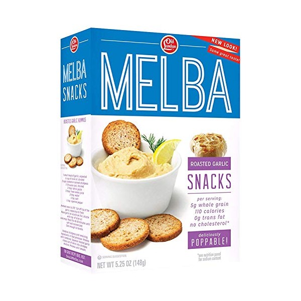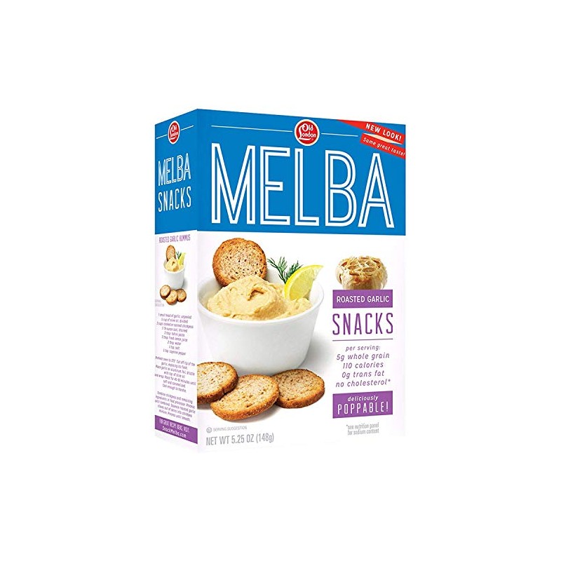 **Old London - Melba Snacks - Roasted Garlic** Melba is the awsome snack with bold flavor & distinctive crunch. Enjoy with toppings, dips & spreads. Perfectly baked for authentic taste & crunch. A healtheir food which you can choose without compromising on taste. **Ingredients:** Wheat Flour, Whole Wheat Flour, Palm Oil, Oat Fiber, Maltodextrin, Salt, Wheat Gluten, Dextrose, Yeast, Garlic Powder, Spices, Onion Powder, Paprika, Distilled Vinegar, Malted Barley Flour, Sugar, Natural Flavor, Soy Lecithin. **To keep fresh - fold bag down and tuck flap in.**