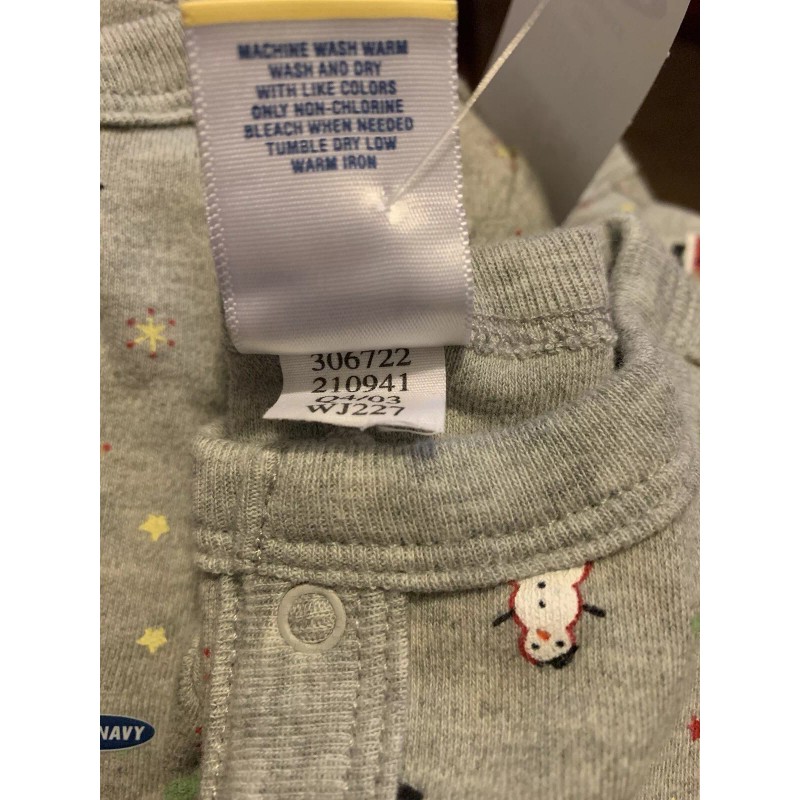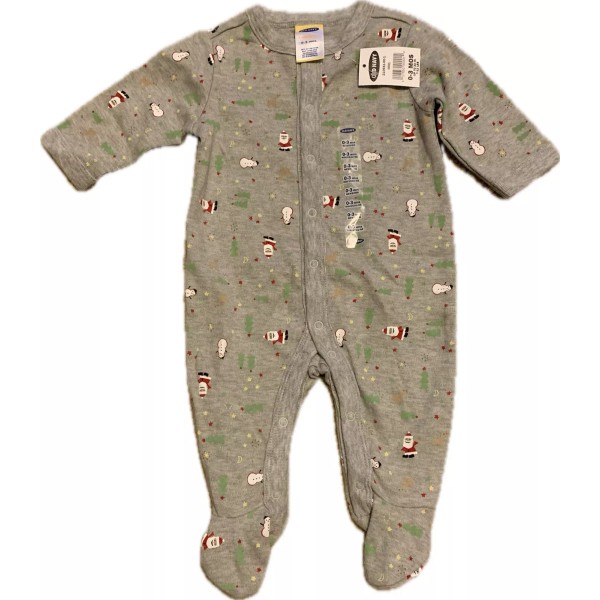 Old Navy newborn footed sleeper with convenient snap closure down both legs. Feature snowflakes, santas, snowmen, Christmas trees and reindeer on a light gray background. Fits up to 23 inches and 7 - 12 pounds. 100% cotton. Machine wash warm, tumble dry low.