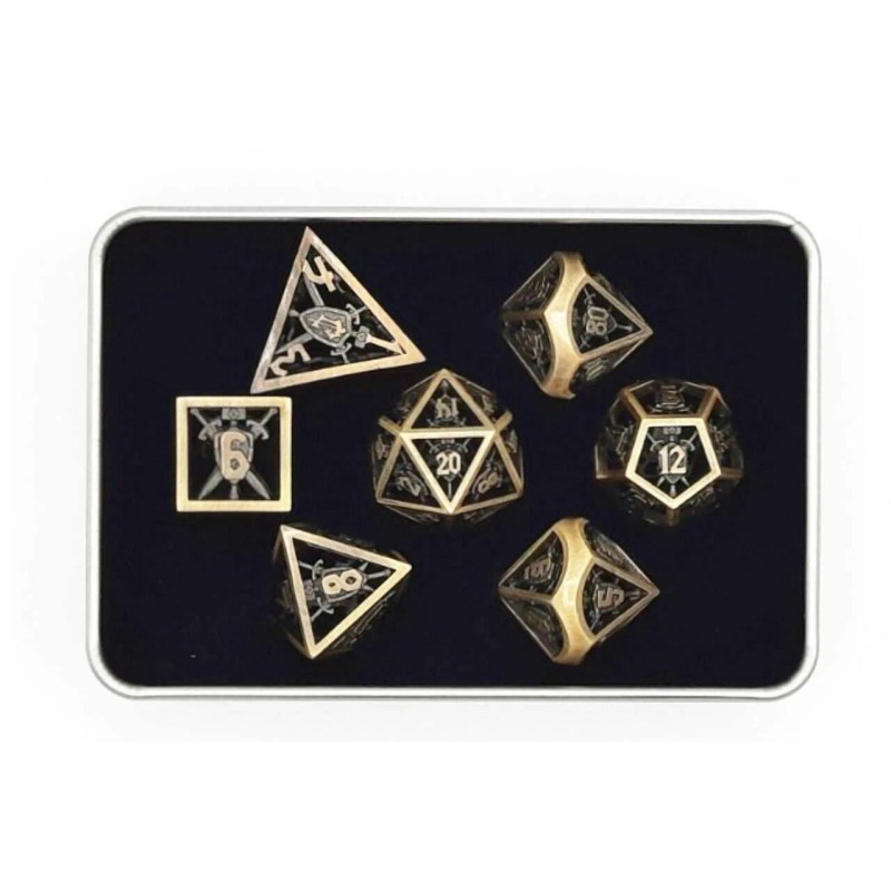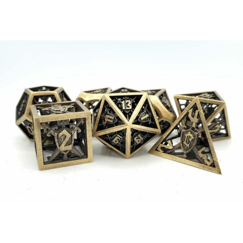 Old School Dice: Hollow Metal 7-Piece Set - Sword & Shield - Brushed Gold
