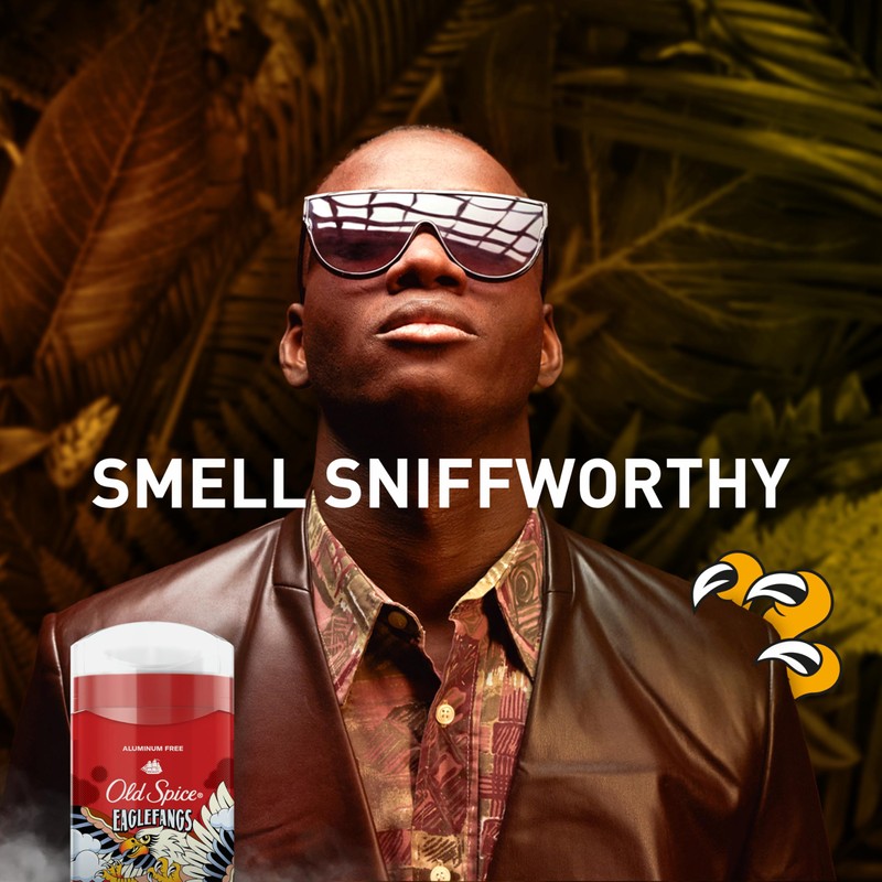 Old Spice Eaglefangs Deodorant for men is an aluminum-free deodorant with triple protection powerunleashing fierce odor protection, goes on clear and has lasting scent. This powerful deodorant goes on clean, leaving you feeling fresh. The scent features the fresh sent of spicy fruits. Dare we say, this is one sniffworthy scent. Is it a bird? Is it a fang? Is it a body wash? Is it a litany of rehetorical questions? Check out the entire Old Spice Wild Collection and smell sniffworthy