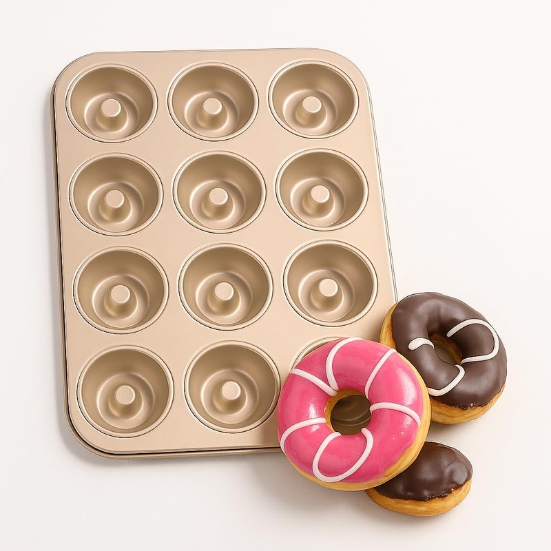 Old Tjikko Doughnuts Baking Mould, 12 Cavities Doughnut Mould, Baking Tray with Non-Stick Coating (12 02) (Gold)