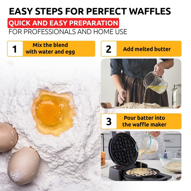 • ✪ EASY STEPS FOR PERFECT WAFFLES: Mix the blend with water and egg, add melted butter, pour into a waffle maker, and bake for perfect results.