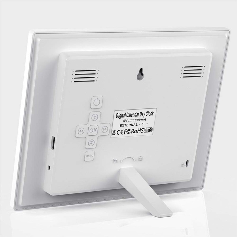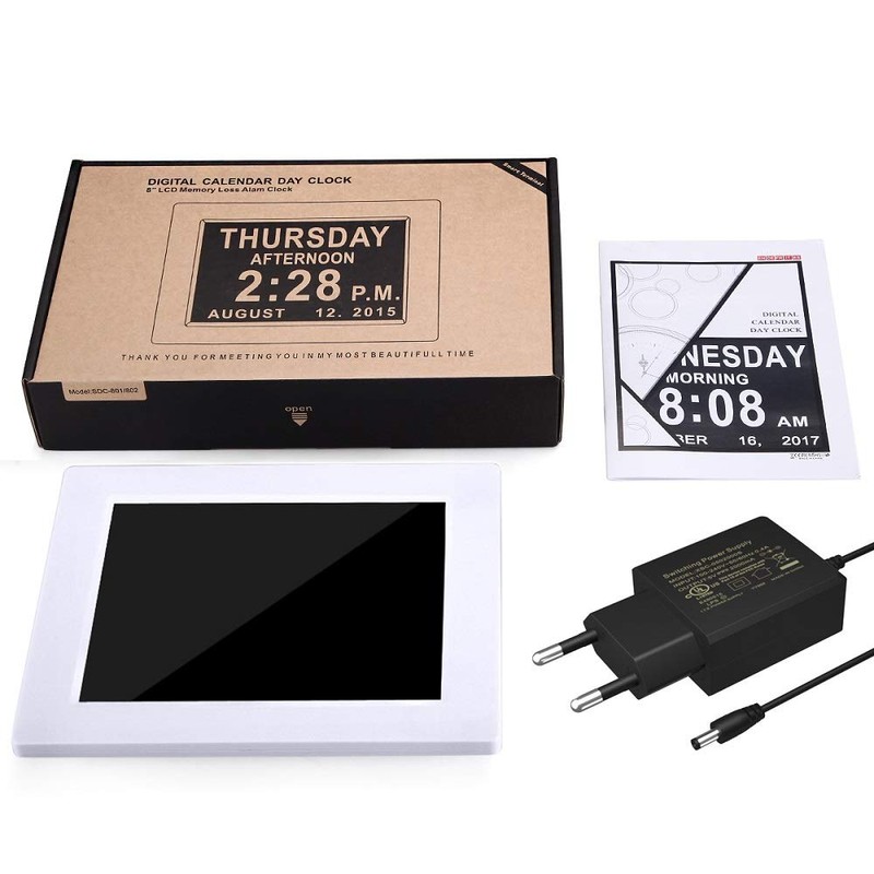 Works straight out of the box, just need to specify the time and date on the power supply (adapter included) - with wide, slightly plastic with LED display with 8 inches (203 mm diagonal) 162 mm wide and 122 mm high - Dimensions including frame 8.5 inches (217 mm) 216 mm wide, 172 mm high and 25 mm. 465 gron (without adapter) – Adapter Box contents: 240 V, Output: 5 V, 1000 mA