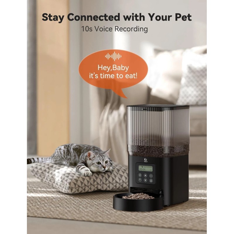 10-Second Voice Meal Call: This timed cat feeder comes with a unique feature allowing you to record a 10-second message. This message will call your pet to the bowl at mealtime, ensuring they are fed regularly and feel safe and cared for.