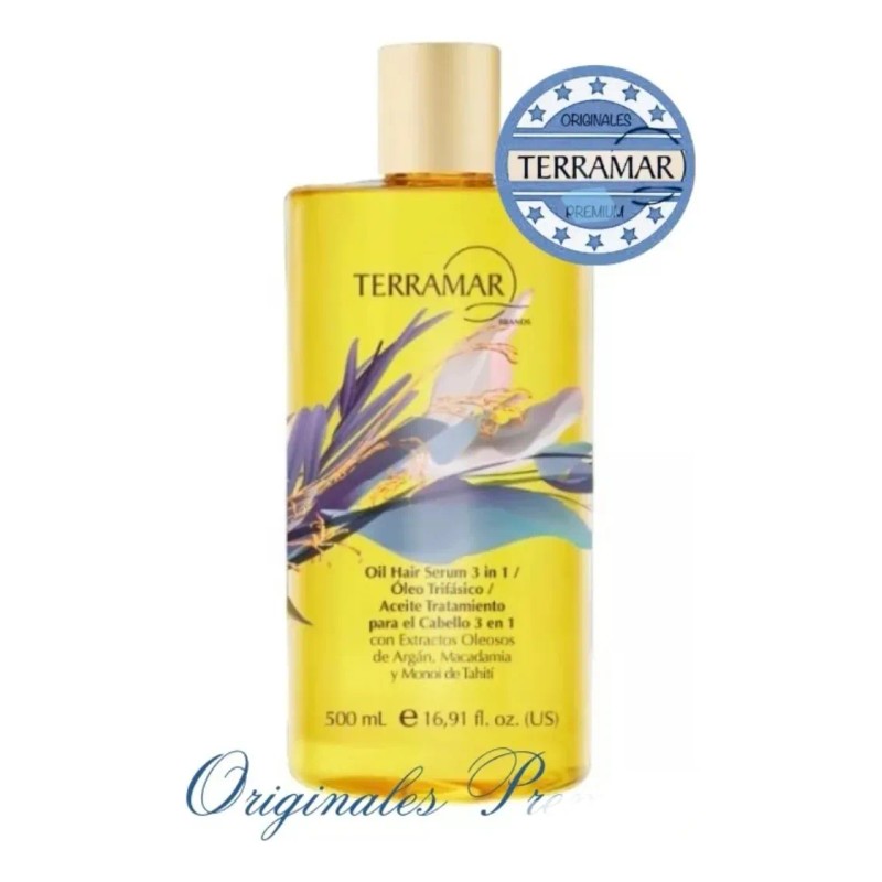El Óleo Jumbo Tratamiento Capilar 3 en 1 de Terramar es la presentación de 500 ml de su reconocido aceite capilar multiusos. Este tratamiento repara el cabello dañado, protege del calor (planchas, secadoras) y aporta un brillo espectacular sin dejar una sensación grasosa. Su fórmula está enriquecida con una potente mezcla de Aceite de Argán, Aceite de Macadamia y Aceite de Monoï de Tahití, que también contribuyen a eliminar el frizz, desenredar y nutrir profundamente. Ideal para un uso prolongado en cabellos secos, dañados o con frizz, ofreciendo un cabello saludable y radiante.