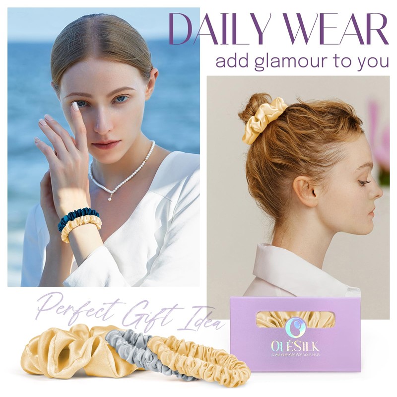 OLESILK fantastic silk scrunchies in beautiful fashionable colours are incomparably super soft and smooth, very gentle on your hair. Suitable for all women and girls. Technically, silk consists of a natural protein and 18 amino acids. Because silk is very similar to our skin, it can protect and prevent your hair from breakage and split ends.