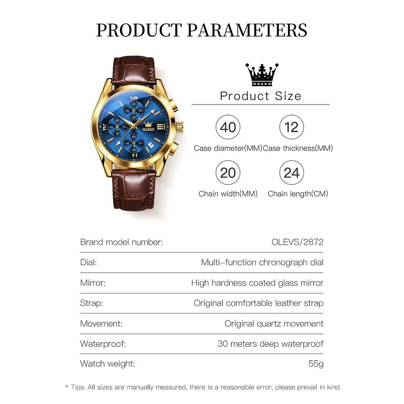 - FASHION & UNIQUE DESIGN Watches are one of the few ornaments on men. OLEVS watches are designed with simple lines and natural arches, stylish gold bezel with unique design of 3 small chronographs (60 minute chronograph, 1/10 second sub-dial, 60 second chronograph) in large white dial with gold index (40 mm). The varied presentation of a gentleman, free and simple, deep, wise and distinctive personality is fully revealed.