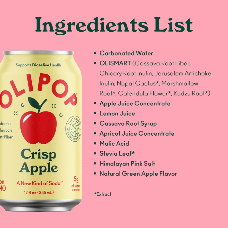 - FRUITY FRESHNESS: Get cans of Olipop Crisp Apple, a satisfying blend of traditional taste with gut-friendly ingredients. Please store refrigerated after receiving (product does not need to ship refrigerated).
