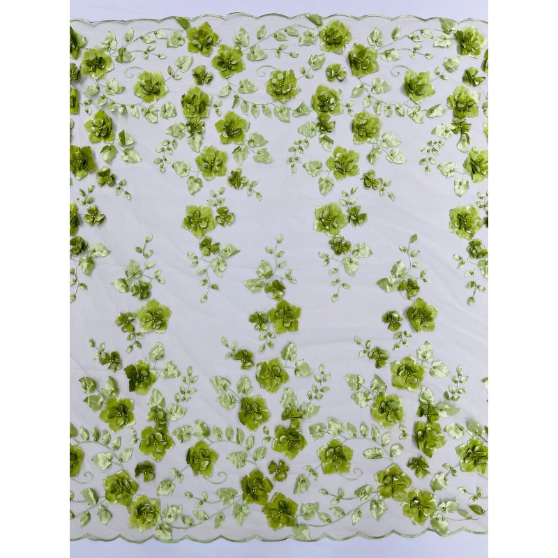 Olive Green Double Scalp Orquidia 3D Floral Design Embroider with Pearl. By Yard
