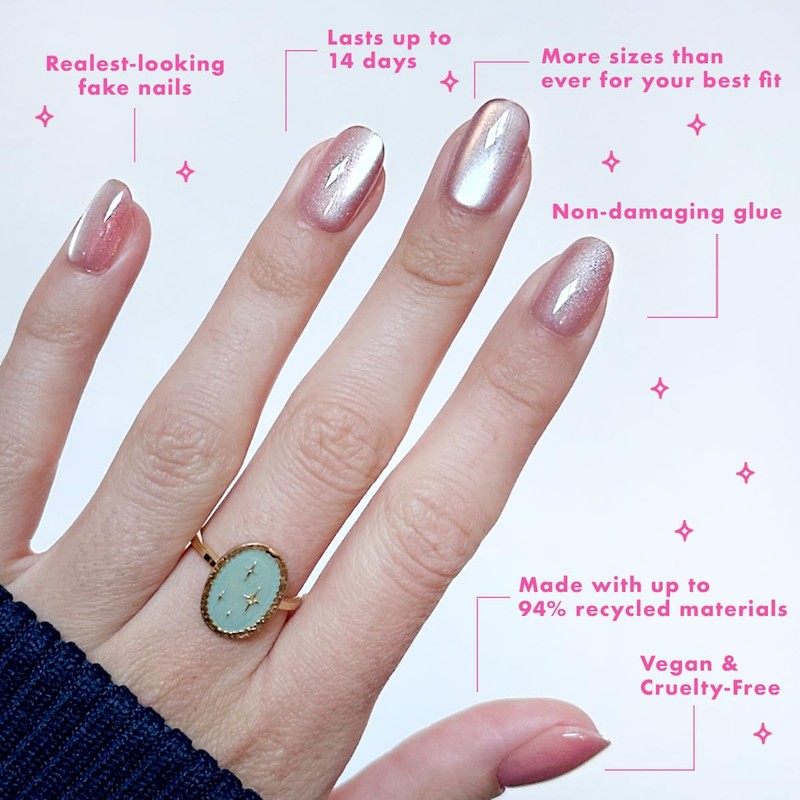 Meet the realest-looking fake nails you've ever seen. The Olive & June Instant Mani is the secret to a salon-quality press-on manicure at homeno appointments, no damage, no compromise. With 42 press-on nails in 21 inclusive sizes, these press-ons are designed with engineers and tested on thousands to ensure your best fit ever. Get up to 14 days of wear. Fake nails never looked so real. Each Instant Mani features custom-shaped nails that mimic the natural curve of your nail for the realest-look. Apply with our non-toxic, non-damaging glue for long-term wear that lasts up to 14 days. Our press-ons are made from 94% post-consumer recycled materials, so they not only look good, they do good. In custom nail shapes and lengths and in all your favorite colors and designs. When you need a mani in an instant, Olive & June delivers. From LA's hottest salon, straight to your doorstep. Since 2013, Olive & June has been bringing their mission of beautiful nails for everyone to life with their innovative all-in-one systems designed to make salon-quality nails accessible. From polish, to press-ons, to gel it's never been easier or more fun to live your best nail life.