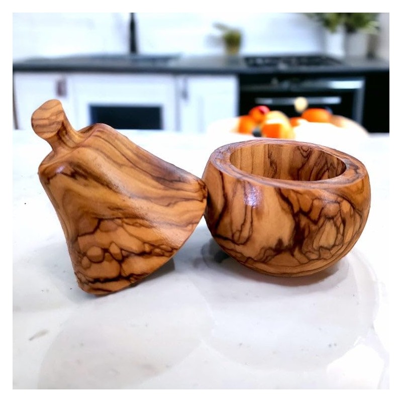 Olive Wood Handcrafted Wooden Sugar Spice Bowl W/Lid | Unique Kitchen Decor Gift Housewarming (Pear)