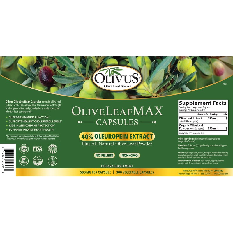 OliveLeafMAX capsules are formulated to provide the power of standardized 40% oleuropein olive leaf extract (250 mg) and the wide spectrum qualities of organic olive leaf powder (250 mg) all in one vegetarian capsule.