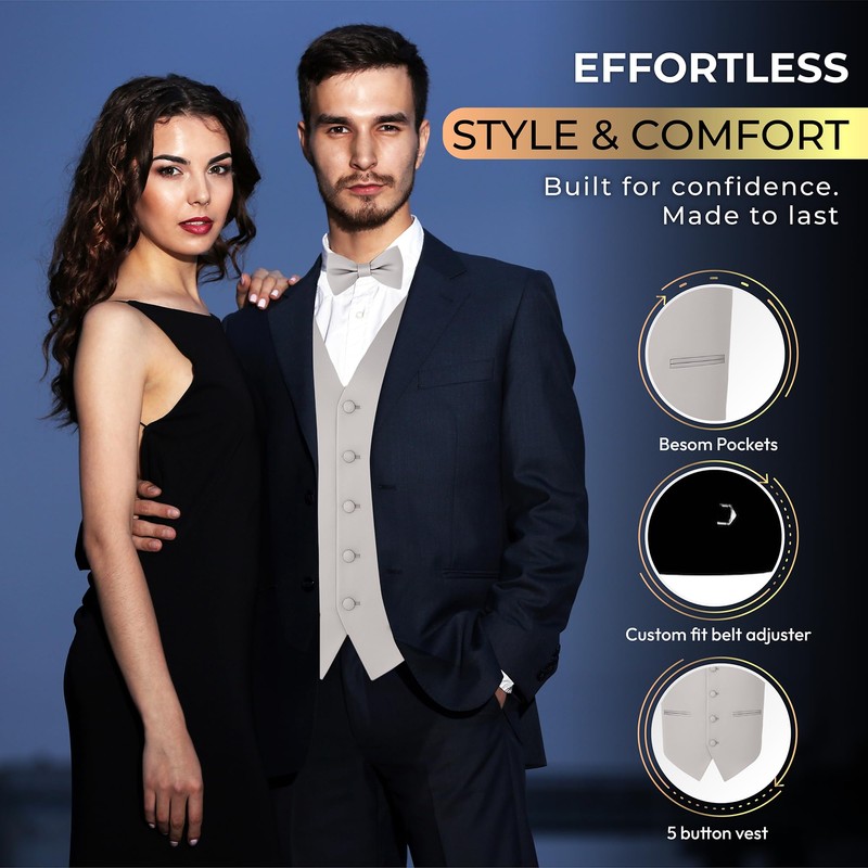 - [PREMIUM QUALITY] Where durability meets comfort — this 4-piece solid vest, tie, bowtie and handkerchief set is crafted from high-quality, breathable fabric that stands up to repeated wear. Easy to maintain and wrinkle-resistant, it keeps you looking sharp and sophisticated with every use.