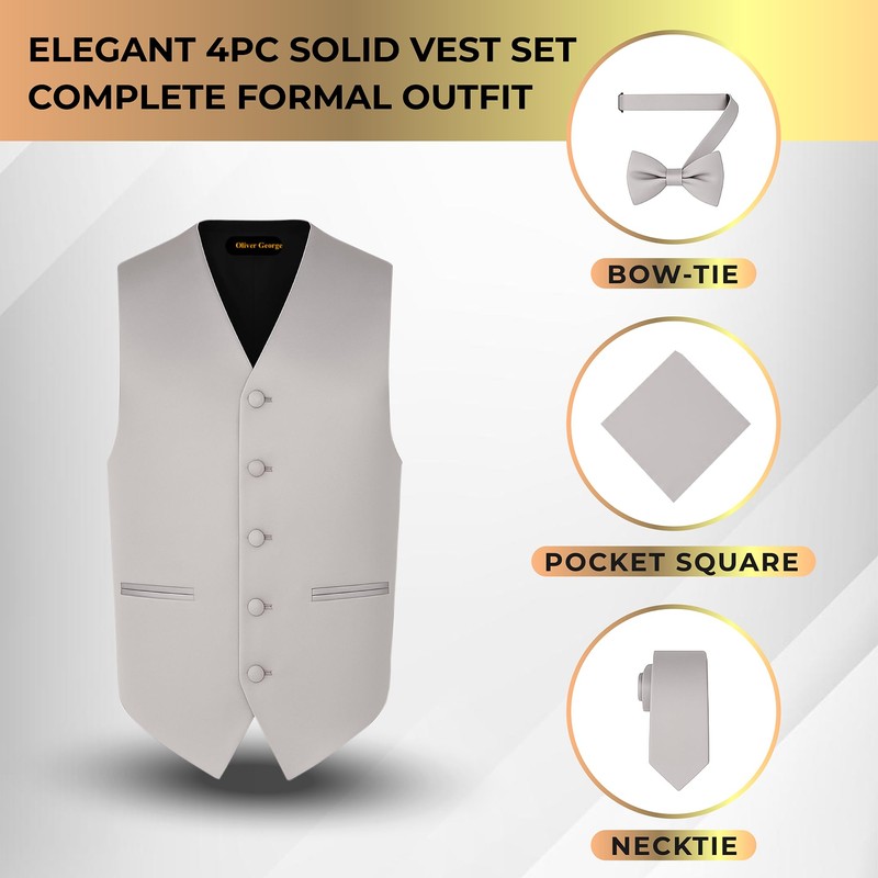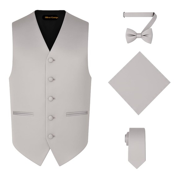 Oliver George 4pc Men's Solid Formal Suit Waistcoat Tuxedo Dress Vest Necktie Bowtie Handkerchief Set for Suit or Tuxedo Silver Large
