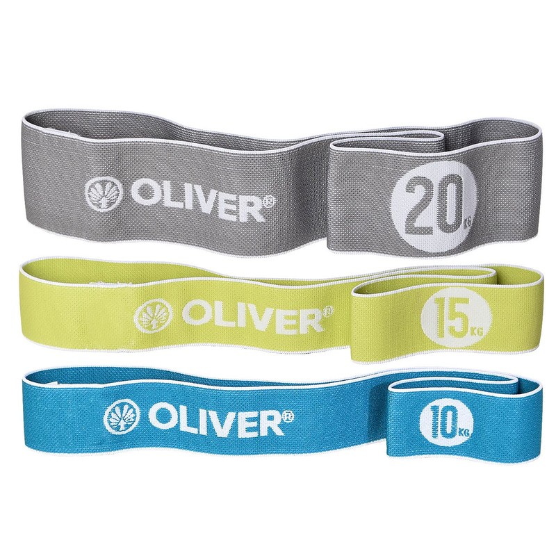 - Box contents: 3 resistance bands Oliver Tex-O mini band; 1 x each resistance (turquoise - 10 kg, green - 15 kg, grey - 20 kg)